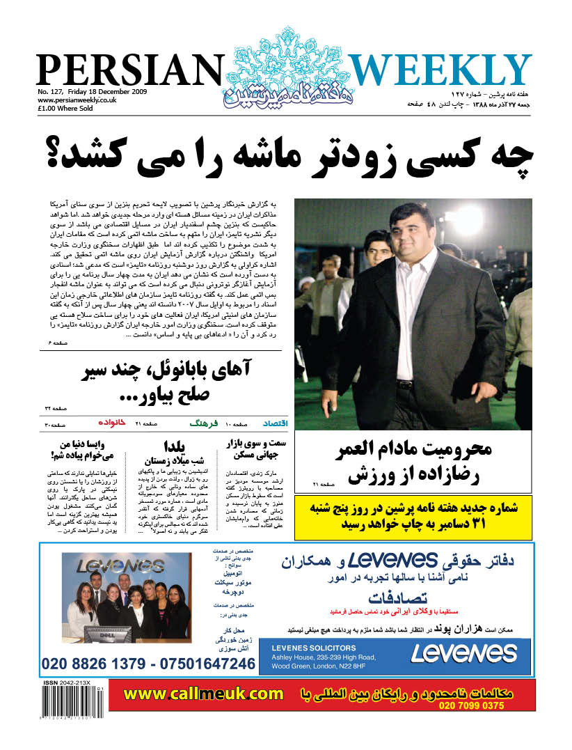 Issue 127 – 18 Dec 2009 persianweekly 4 دسامبر 2009 سال سوم 2009 - شماره 77 تا شماره 128 دیدگاهها برای Issue 127 – 18 Dec 2009 بسته هستند 94 Views Related Articles Issue 128 – 25 Dec 2009 4 دسامبر 2009 Issue 126 – 11 Dec 2009 4 دسامبر 2009 Issue 125 – 4 Dec 2009 4 دسامبر 2009 Share Facebook Twitter Stumbleupon LinkedIn Pinterest