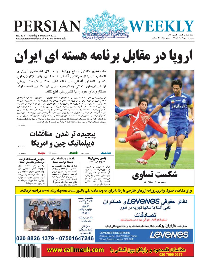 Issue 133 – 5 Feb 2010 persianweekly 5 فوریه 2010 سال چهارم 2010 - شماره 129 تا شماره 179 دیدگاهها برای Issue 133 – 5 Feb 2010 بسته هستند 81 Views Related Articles Issue 179 – 24 Dec 2010 3 دسامبر 2010 Issue 176 – 3 Dec 2010 3 دسامبر 2010 Issue 177 – 10 Dec 2010 3 دسامبر 2010 Share Facebook Twitter Stumbleupon LinkedIn Pinterest