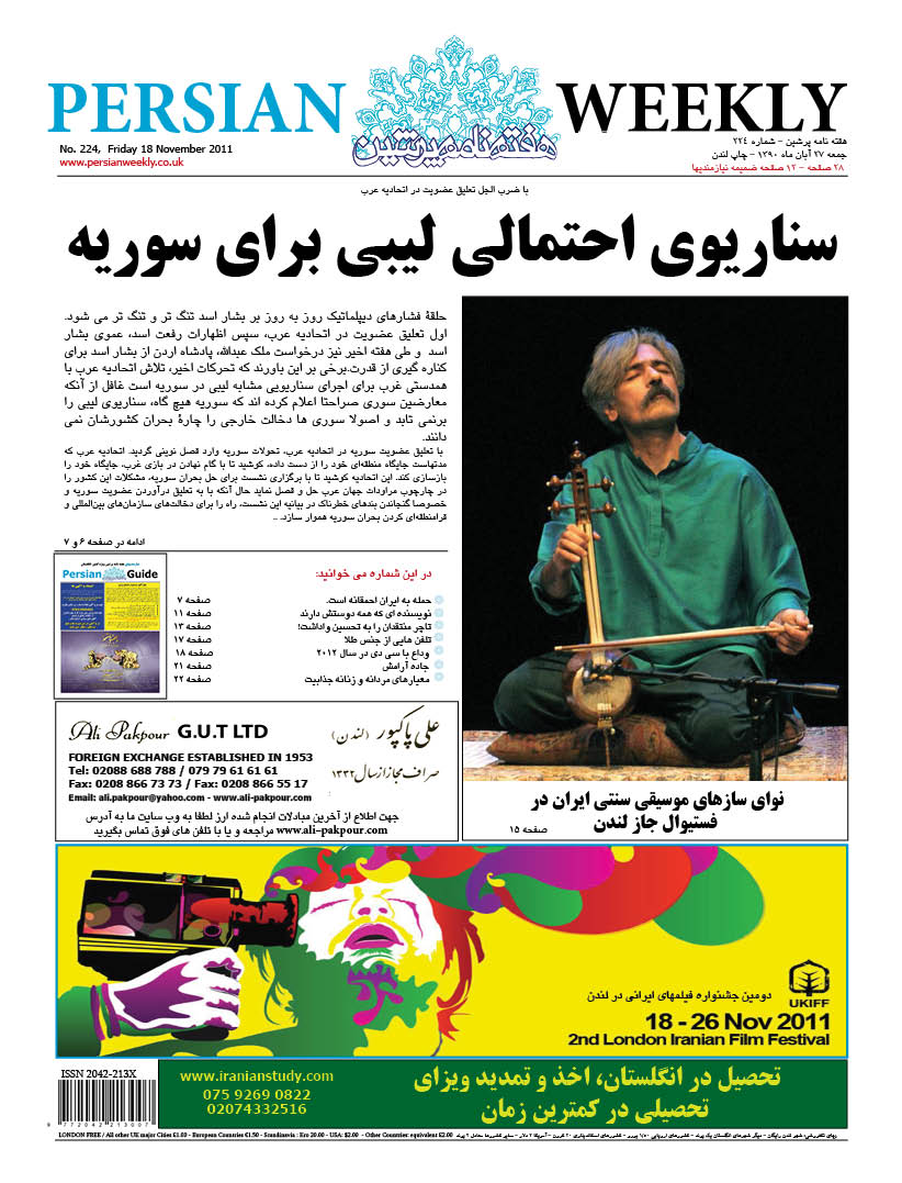 Issue 224 – 18 Nov 2011 persianweekly 4 نوامبر 2011 سال پنجم 2011 - شماره 180 تا شماره 229 دیدگاهها برای Issue 224 – 18 Nov 2011 بسته هستند 86 Views Related Articles Issue 229 – 23 Dec 2011 2 دسامبر 2011 Issue 228 – 16 Dec 2011 2 دسامبر 2011 Issue 226 – 2 Dec 2011 2 دسامبر 2011 Share Facebook Twitter Stumbleupon LinkedIn Pinterest