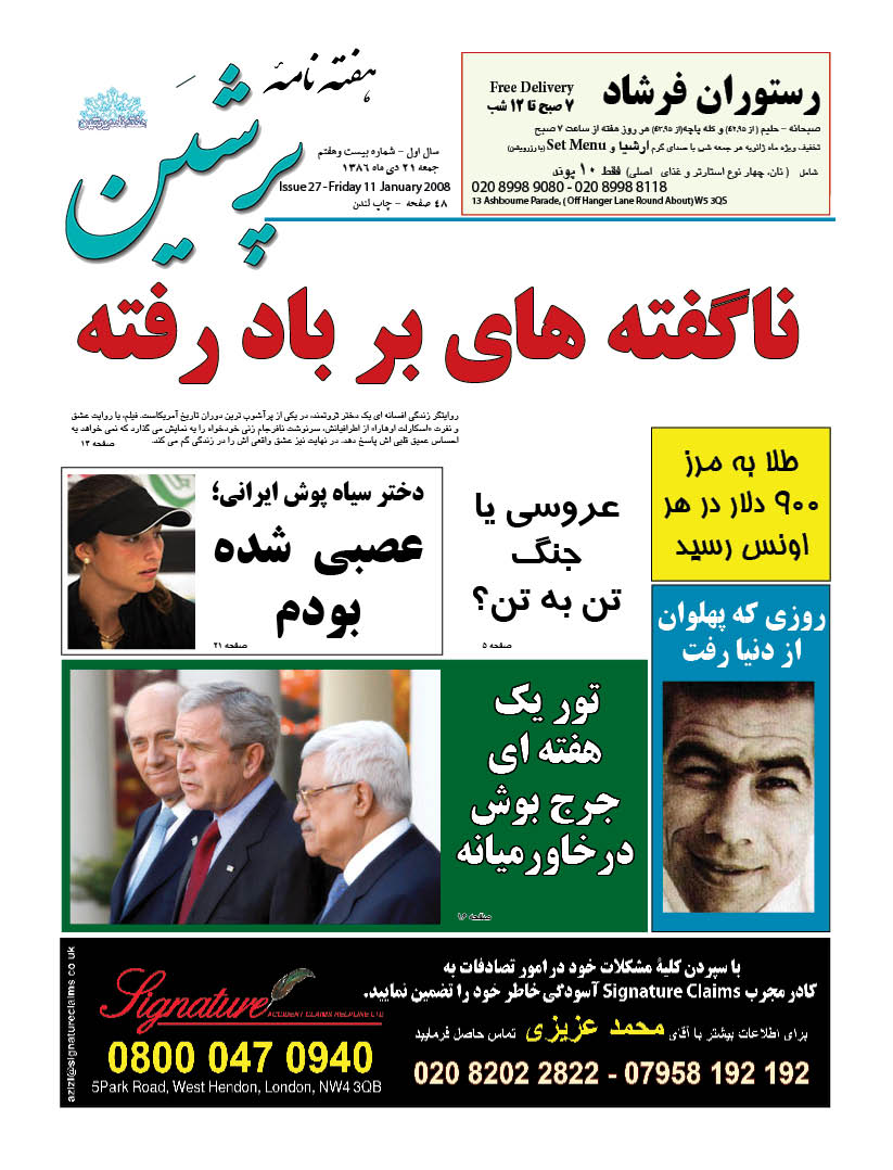 Issue 27 – 11 Jan 2008 persianweekly 4 ژانویه 2008 سال دوم 2008 - شماره 26 تا شماره 76 دیدگاهها برای Issue 27 – 11 Jan 2008 بسته هستند 67 Views Related Articles Issue 75 – 12 Dec 2008 5 دسامبر 2008 Issue 76 – 19 Dec 2008 5 دسامبر 2008 Issue 74 – 5 Dec 2008 5 دسامبر 2008 Share Facebook Twitter Stumbleupon LinkedIn Pinterest