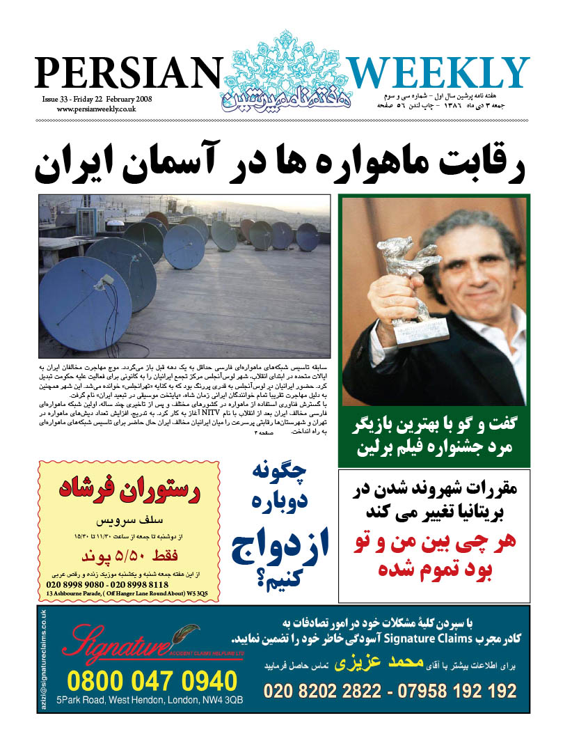 Issue 33 – 22 Feb 2008 persianweekly 1 فوریه 2008 سال دوم 2008 - شماره 26 تا شماره 76 دیدگاهها برای Issue 33 – 22 Feb 2008 بسته هستند 72 Views Related Articles Issue 75 – 12 Dec 2008 5 دسامبر 2008 Issue 76 – 19 Dec 2008 5 دسامبر 2008 Issue 74 – 5 Dec 2008 5 دسامبر 2008 Share Facebook Twitter Stumbleupon LinkedIn Pinterest