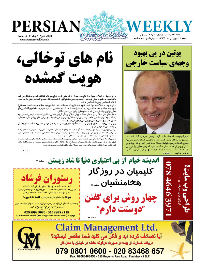 Issue 39 – 4 April 2008 persianweekly 4 آوریل 2008 سال دوم 2008 - شماره 26 تا شماره 76 دیدگاهها برای Issue 39 – 4 April 2008 بسته هستند 272 Views Related Articles Issue 75 – 12 Dec 2008 5 دسامبر 2008 Issue 76 – 19 Dec 2008 5 دسامبر 2008 Issue 74 – 5 Dec 2008 5 دسامبر 2008 Share Facebook Twitter Stumbleupon LinkedIn Pinterest