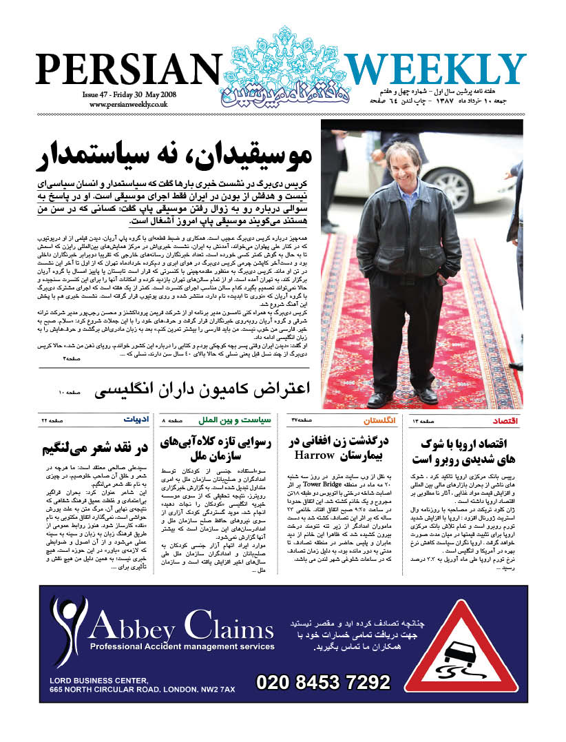 Issue 47 – 30 May 2008 persianweekly 2 می 2008 سال دوم 2008 - شماره 26 تا شماره 76 دیدگاهها برای Issue 47 – 30 May 2008 بسته هستند 79 Views Related Articles Issue 75 – 12 Dec 2008 5 دسامبر 2008 Issue 76 – 19 Dec 2008 5 دسامبر 2008 Issue 74 – 5 Dec 2008 5 دسامبر 2008 Share Facebook Twitter Stumbleupon LinkedIn Pinterest