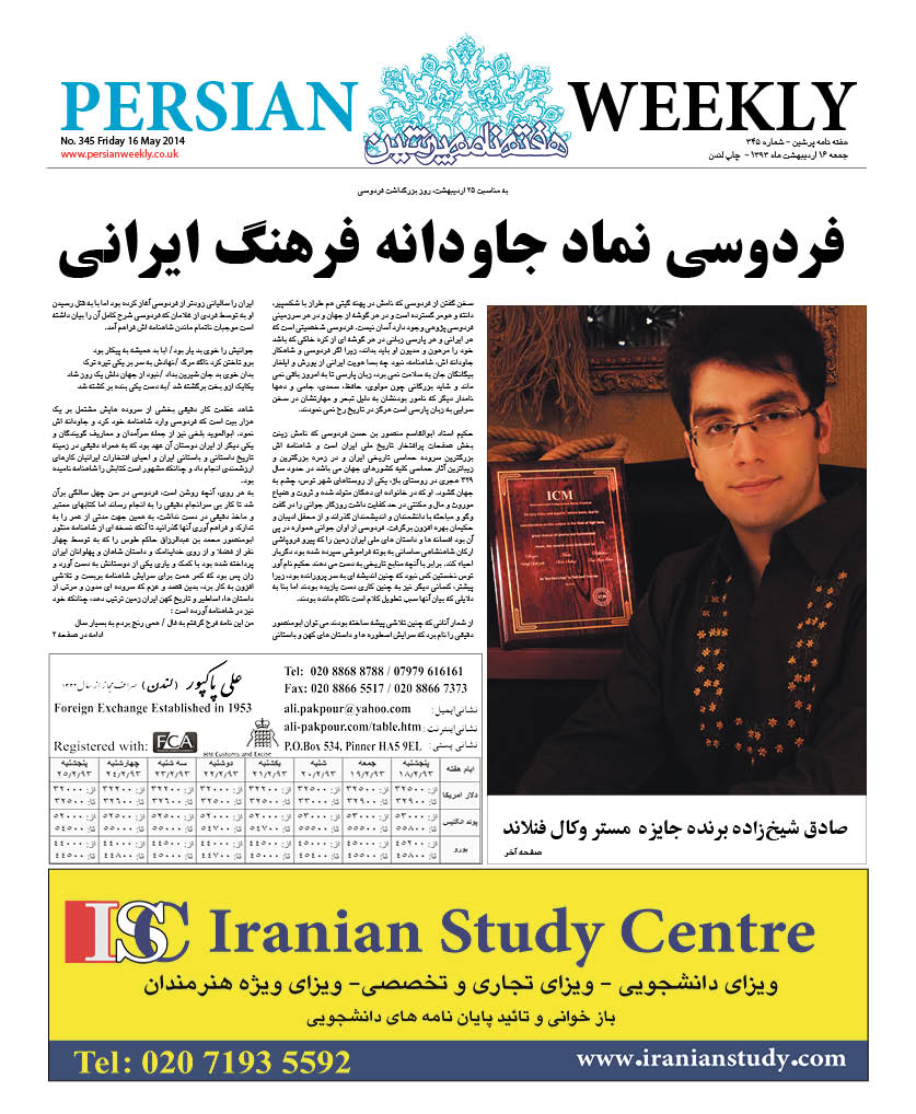 Issue 345- 16 May 2014 persianweekly 16 می 2014 سال هشتم 2014 - شماره 328- تا شماره 376 دیدگاهها برای Issue 345- 16 May 2014 بسته هستند 81 Views Related Articles Issue 376- 19 Dec 2014 19 دسامبر 2014 Issue 375- 12 Dec 2014 12 دسامبر 2014 Issue 374- 5 Dec 2014 5 دسامبر 2014 Share Facebook Twitter Stumbleupon LinkedIn Pinterest