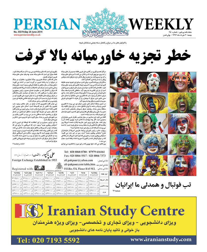 Issue 350- 20 June 2014 persianweekly 20 ژوئن 2014 سال هشتم 2014 - شماره 328- تا شماره 376 دیدگاهها برای Issue 350- 20 June 2014 بسته هستند 79 Views Related Articles Issue 376- 19 Dec 2014 19 دسامبر 2014 Issue 375- 12 Dec 2014 12 دسامبر 2014 Issue 374- 5 Dec 2014 5 دسامبر 2014 Share Facebook Twitter Stumbleupon LinkedIn Pinterest