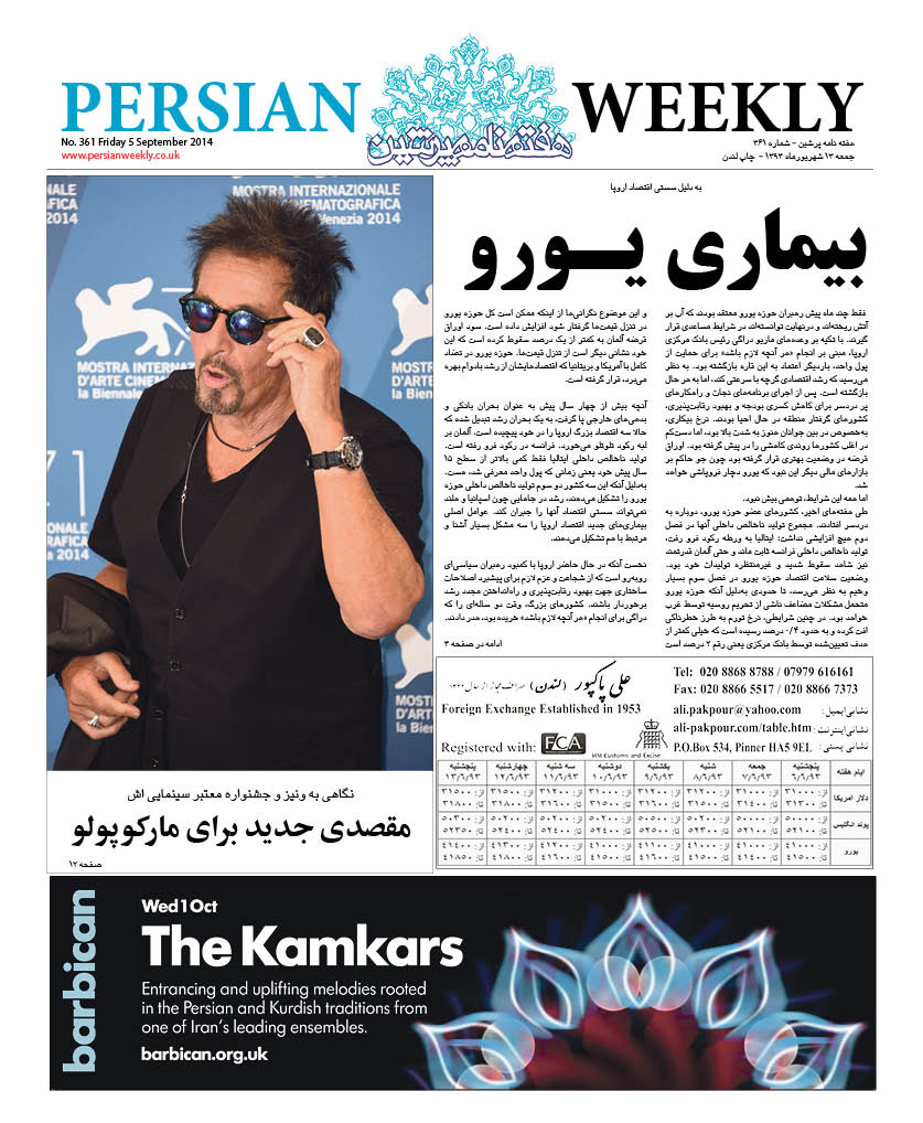 Issue 361- 5 Sep 2014 persianweekly 5 سپتامبر 2014 سال هشتم 2014 - شماره 328- تا شماره 376 دیدگاهها برای Issue 361- 5 Sep 2014 بسته هستند 86 Views Related Articles Issue 376- 19 Dec 2014 19 دسامبر 2014 Issue 375- 12 Dec 2014 12 دسامبر 2014 Issue 374- 5 Dec 2014 5 دسامبر 2014 Share Facebook Twitter Stumbleupon LinkedIn Pinterest