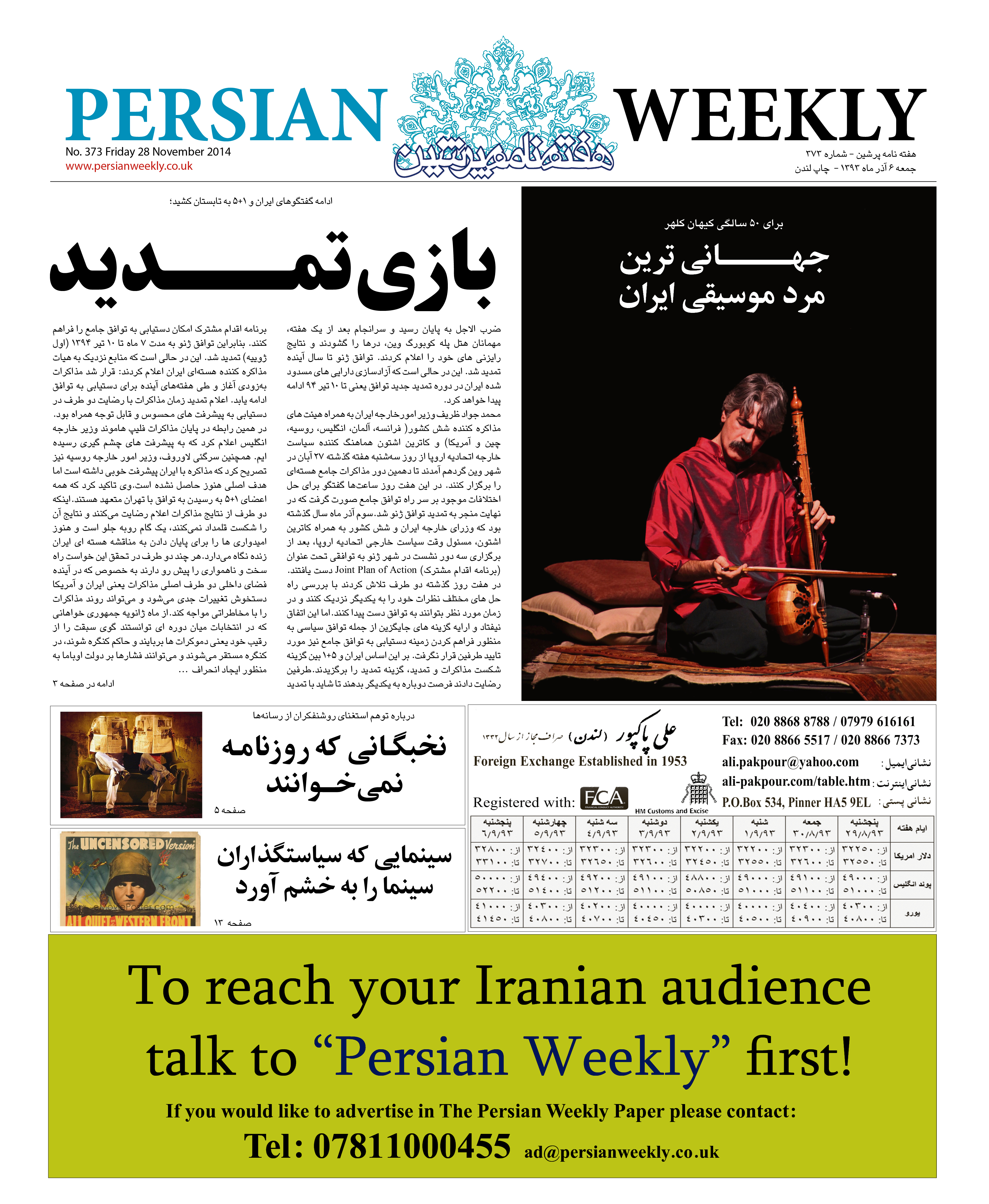 Issue 373- 28 Nov 2014 persianweekly 28 نوامبر 2014 سال هشتم 2014 - شماره 328- تا شماره 376 دیدگاهها برای Issue 373- 28 Nov 2014 بسته هستند 87 Views Related Articles Issue 376- 19 Dec 2014 19 دسامبر 2014 Issue 375- 12 Dec 2014 12 دسامبر 2014 Issue 374- 5 Dec 2014 5 دسامبر 2014 Share Facebook Twitter Stumbleupon LinkedIn Pinterest