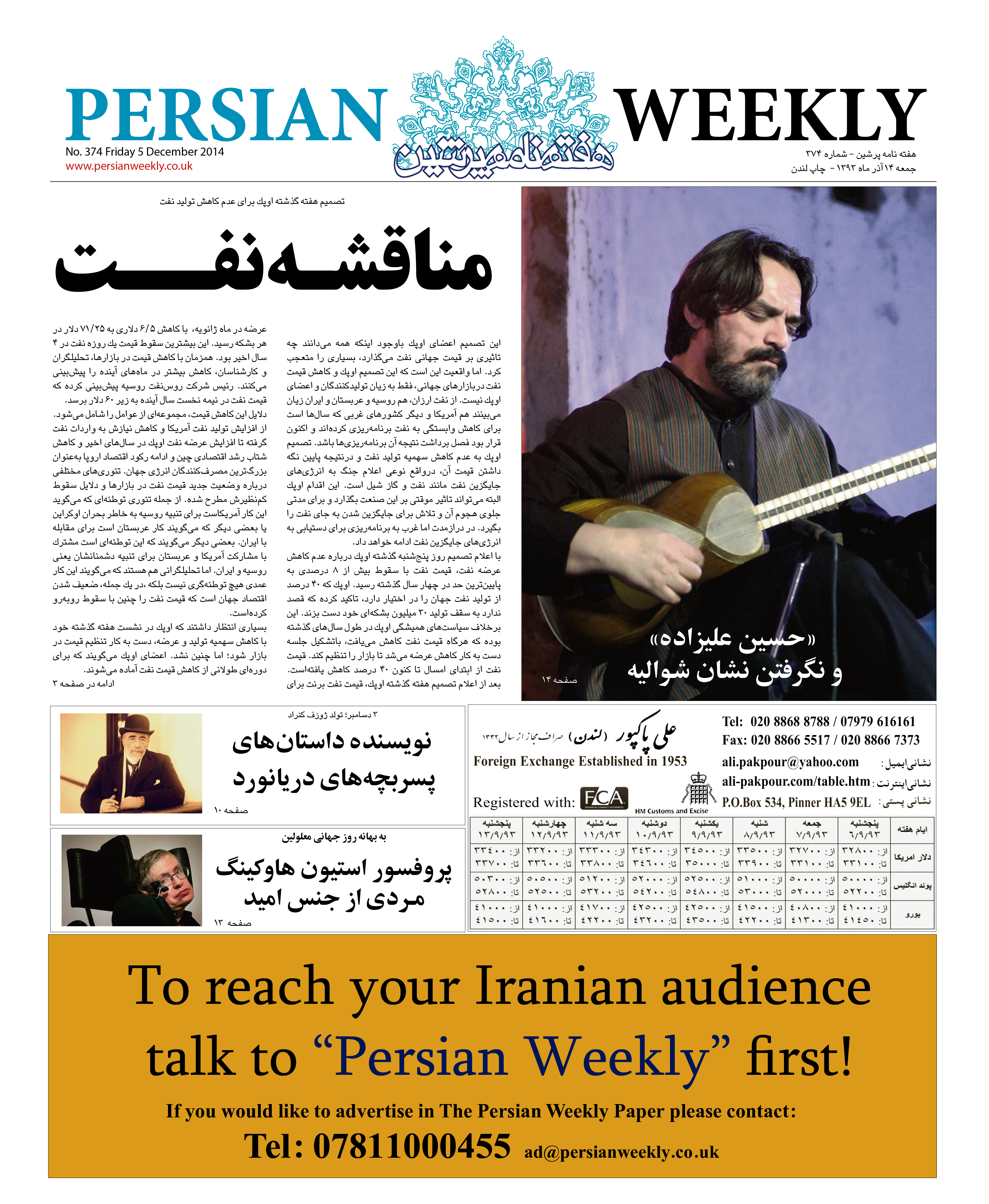 Issue 374- 5 Dec 2014 persianweekly 5 دسامبر 2014 سال هشتم 2014 - شماره 328- تا شماره 376 دیدگاهها برای Issue 374- 5 Dec 2014 بسته هستند 102 Views Related Articles Issue 376- 19 Dec 2014 19 دسامبر 2014 Issue 375- 12 Dec 2014 12 دسامبر 2014 Issue 373- 28 Nov 2014 28 نوامبر 2014 Share Facebook Twitter Stumbleupon LinkedIn Pinterest