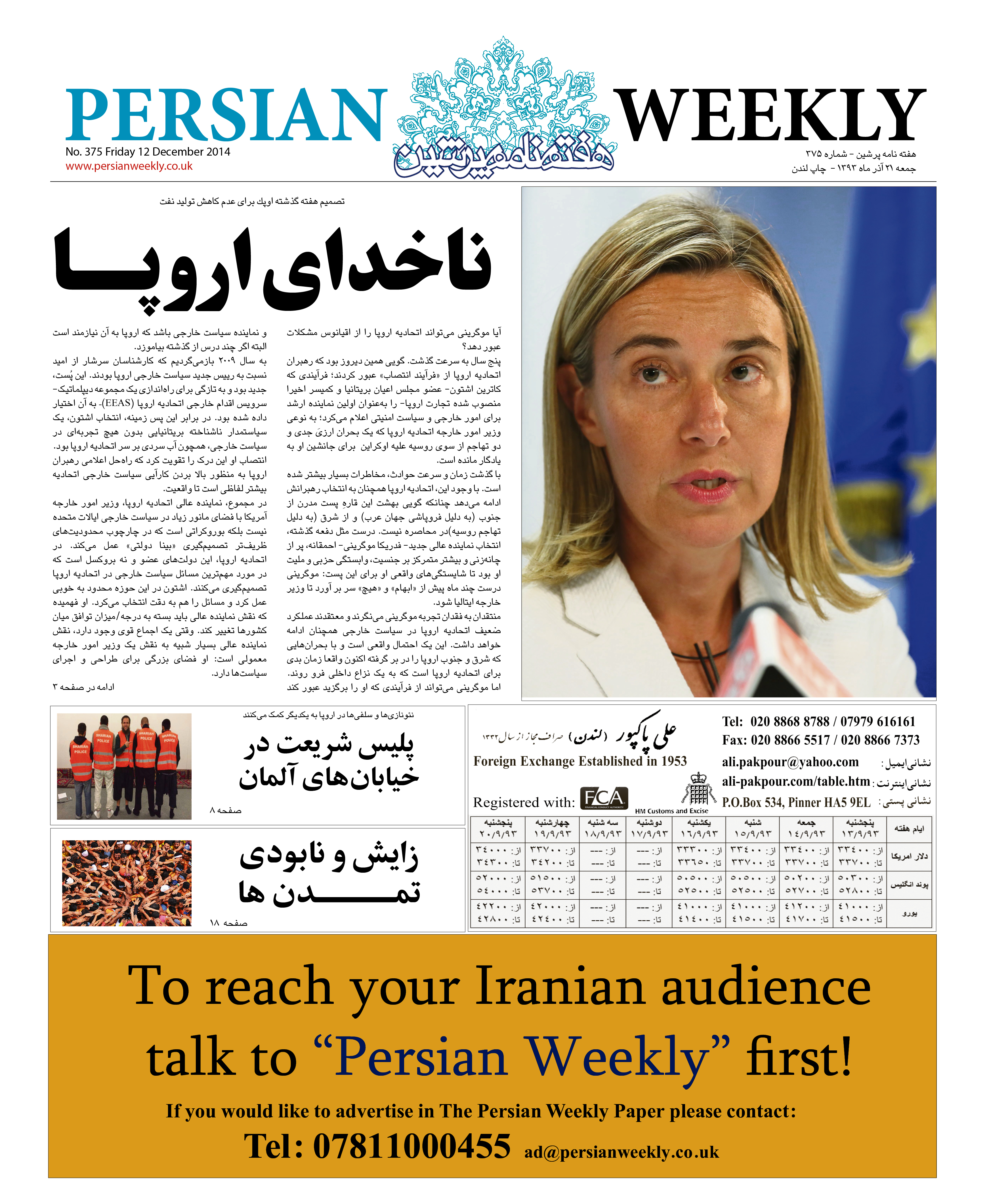 Issue 375- 12 Dec 2014 persianweekly 12 دسامبر 2014 سال هشتم 2014 - شماره 328- تا شماره 376 دیدگاهها برای Issue 375- 12 Dec 2014 بسته هستند 76 Views Related Articles Issue 376- 19 Dec 2014 19 دسامبر 2014 Issue 374- 5 Dec 2014 5 دسامبر 2014 Issue 373- 28 Nov 2014 28 نوامبر 2014 Share Facebook Twitter Stumbleupon LinkedIn Pinterest