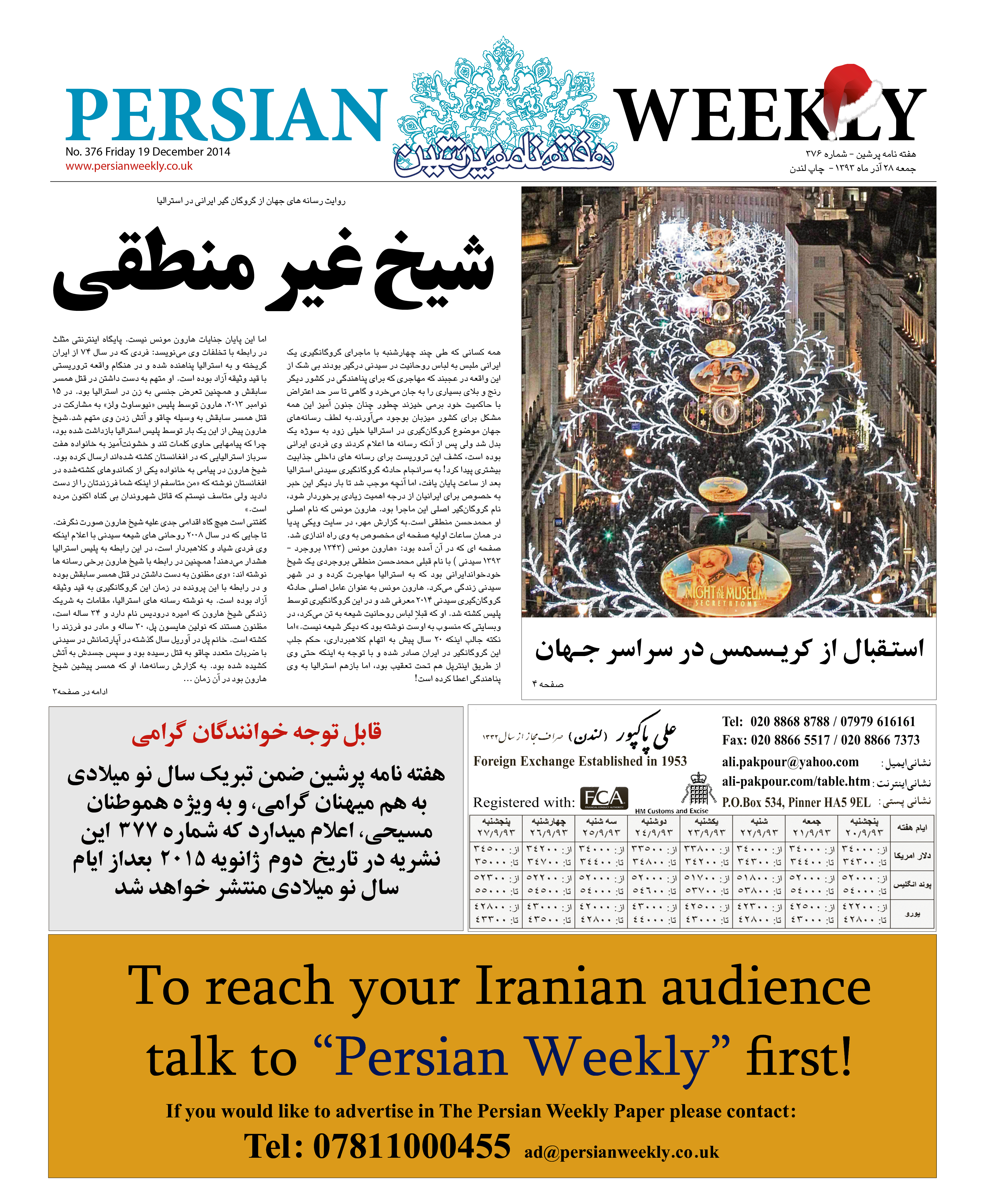 Issue 376- 19 Dec 2014 persianweekly 19 دسامبر 2014 سال هشتم 2014 - شماره 328- تا شماره 376 دیدگاهها برای Issue 376- 19 Dec 2014 بسته هستند 80 Views Related Articles Issue 375- 12 Dec 2014 12 دسامبر 2014 Issue 374- 5 Dec 2014 5 دسامبر 2014 Issue 373- 28 Nov 2014 28 نوامبر 2014 Share Facebook Twitter Stumbleupon LinkedIn Pinterest